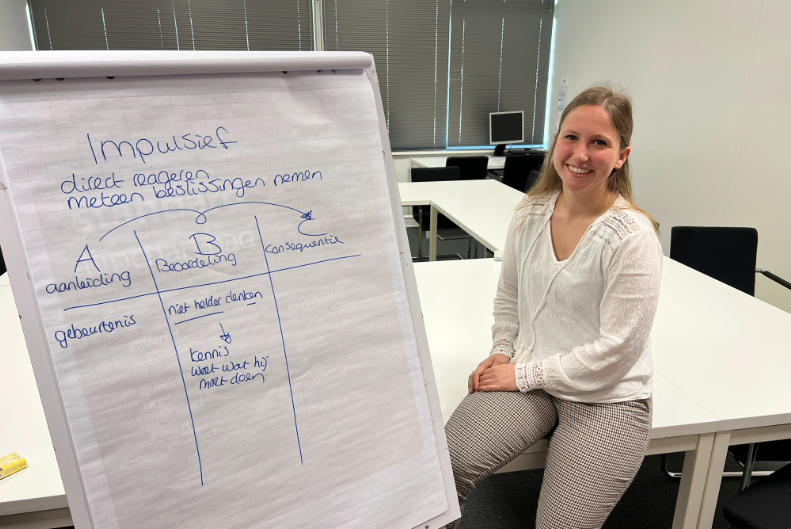 Als we Stefanie vragen hoe het is om te werken met groepen dan zien we meteen een brede glimlach op haar gezicht: “ik vind het nog steeds indrukwekkend dat je merkt dat je niet voor niets staat te praten. Reclassenten die een training volgen zijn vaak gemotiveerd. Soms heb je wel eens reclassenten die ongemotiveerd zijn, dan denk je wel: als dit maar goed gaat. Maar vaak trekt de groep iemand vanzelf uit die negatieve spiraal. Dan hoor je ze onderling fluisteren dat het allemaal zo erg niet is, en dat je veel kunt leren.” Stefanie vervolgt, opnieuw met een verse glimlach op haar gezicht: “En weet je, eigenlijk is het ook echt helemaal niet zo erg om een training te moeten volgen: de training is leerzaam en de sfeer in de groep is vaak goed!”
