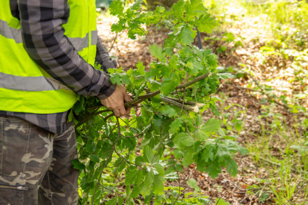 (Twee mannen voeren werkzaamheden uit bij een boom.)